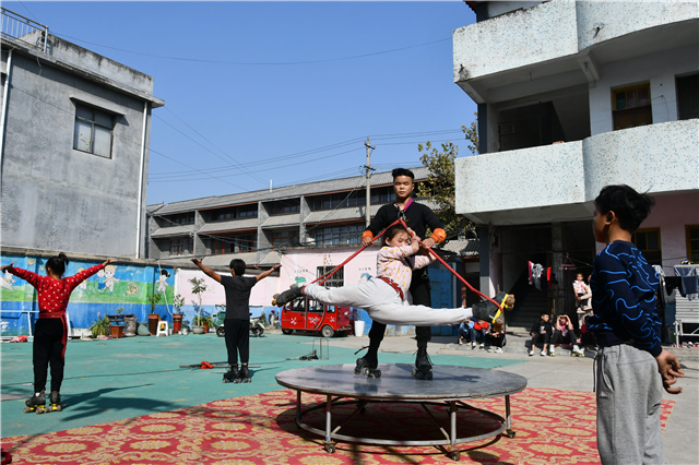 ▲杂技演员在韦寨镇韦小庄杂技专业村演出。图/柳春玲