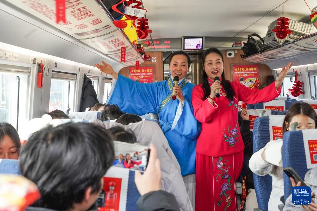 1月13日,在C3685次列车上,身着戏服的铁路工作人员为旅客表演黄梅戏。
