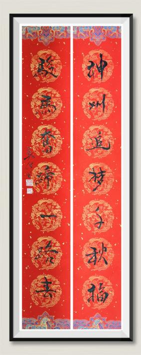 俞关佑书法对联作品《神州追梦千秋福 骏马奋蹄一路春》