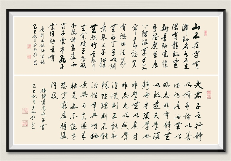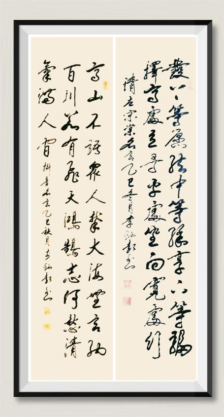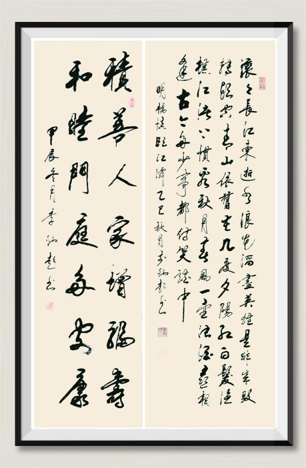 左:《高山不语众人攀 大海无言纳百川 若有飞天鸿鹄志 何愁清气满人间》