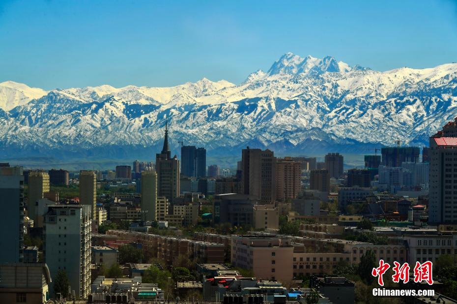 5月8日,经过雨雪天气“洗刷”后的新疆首府乌鲁木齐市晴空万里,海拔5445米的天山山脉东段最高峰——博格达峰清晰可见,蔚为壮观,仿佛与城市相连。中新社记者 刘新 摄