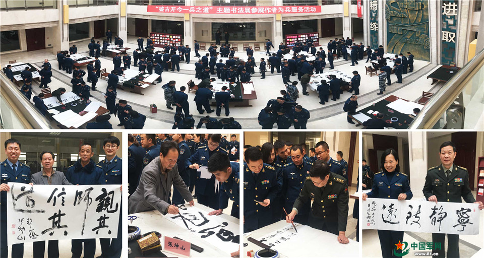 为兵服务是军事文艺的根本宗旨,也是策划组织《鉴古开今》书展的初心。三年来,展览在北京、石家庄、济南、上海、深圳、大连、长春、海口多地巡展的同时,还组织参展书家深入北疆大漠,走进演训场和任务一线,开展为兵服务、赠送书法作品等活动,深受部队欢迎。2016年,组织首届《鉴古开今》20位军旅书家,为全军各部队捐赠了全部参展作品100件。2017年,将第二届书展20位书家创作的100件精品,专门组织捐赠给陆军朱日和训练基地和空军鼎新训练基地。2018年,组织第三届30位参展书家,重点为三个部队、院校单位量身创作彰显部队职能任务、弘扬优良传统、宣传练兵备战的书法作品近200件,展出后全部捐赠部队营区悬挂,使之成为“永不落幕的展览”。还结合巡展和部队需要,多次组织军旅书家深入基层为兵创作,并通过笔会交流、名师辅导面对面等形式,点燃书法爱好者的梦想,为部队培养书法骨干,浓厚部队文化氛围。