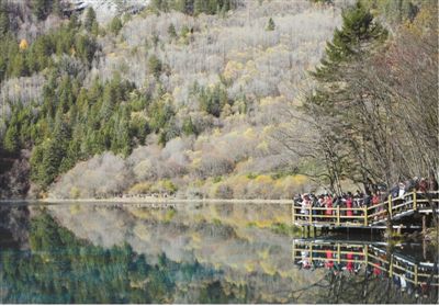 图为游客欣赏九寨沟原始森林湖泊的美丽秋景。