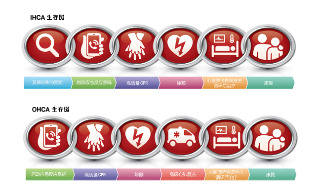 图1 《2020 美国心脏协会心肺复苏与心血管急救指南》院内心搏骤停(IHCA)与院外心搏骤停(OHCA)生存链