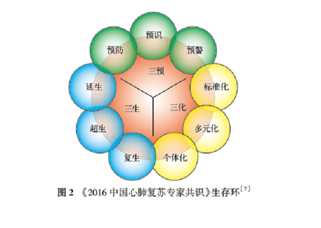 无疑《指南》对于“生存链”理念的发展并提出系统救治的理论是《指南》定性的重大进展与认识提升,是典型的西方思维方式的体现。而《共识》将心肺复苏救治定性为“生存环”的救治模式,即心脏骤停前期的预防、预识、预警,心脏骤停中期的标准化、多元化、个体化,心脏骤停后期的复生、超生、延生,强调防治结合、环环相扣、牢不可破,体现的是对生命循环、轮回的东方思考(图2)。