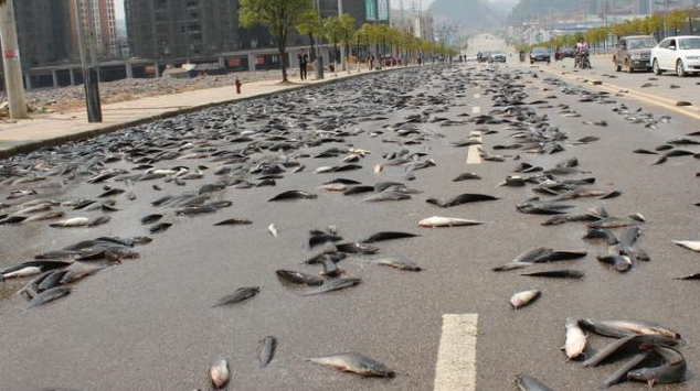 2015年3月17日,一辆装载13600斤鲶鱼的大货车途经贵州黔东南州凯里市开发区时,因货箱门意外开启,导致车上的鲶鱼散落公路沿线,公路瞬间成“鱼池”。图片来源:东方IC 版权作品 请勿转载