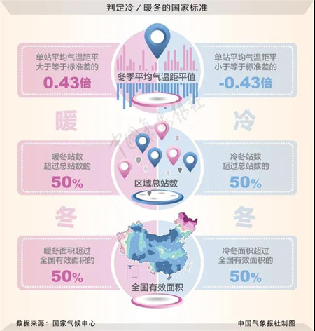 国家气候中心制定的《暖冬等级》国家标准于2008年发布实施,《冷冬等级》国家标准于2017年发布实施。根据国家标准,判定冷冬、暖冬的基本要素为冬季(12月至次年2月)三个月的平均气温,在空间上分为单站、区域、全国三个范围等级。