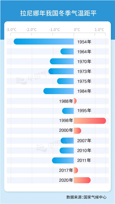 国家气候中心表示,通过分析1951年以来历史上15次拉尼娜事件发现,有10个拉尼娜年我国冬季气温偏低,5个拉尼娜年我国冬季气温偏高。也就是说,不是每个拉尼娜年的冬季平均气温都偏低;出现拉尼娜事件以后,我国冬季偏冷的概率更大一些,约是偏暖概率的两倍。
