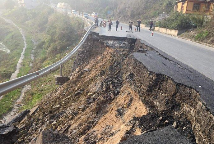 2015年3月17日下午15时30分许,贵州省S308省道凯里市境内箐口段271公里加300处发生一起严重公路坍塌事故,该路段出现50米长的路基裂缝和出现30米长、宽6米的公路路基下塌,事故造成交通暂时中断,凯里公路管理段正在组织抢险人员和调集装载机在该段公路右侧紧急抢修,开辟一条便道供小汽车通行。事故无人员伤亡。图片来源:CFP视觉中国