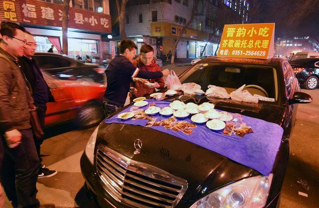2015年3月18日晚8时许,两辆“大奔”并排停在太原市太原理工大学门外,“大奔”的前机盖上摆满了山西特色小吃“碗秃”,几名年轻人不时在车前叫卖。来往的行人纷纷驻足围观,偶尔也有人上前购买品尝。摊主小周说:“今天是第一天在这摆摊,看的人多,买的人少,一晚上只卖出去三十多碗,不过天气暖和了,开车出来摆摊挣个油钱,和朋友聚聚,卖多卖少无所谓。”图片来源:CFP视觉中国