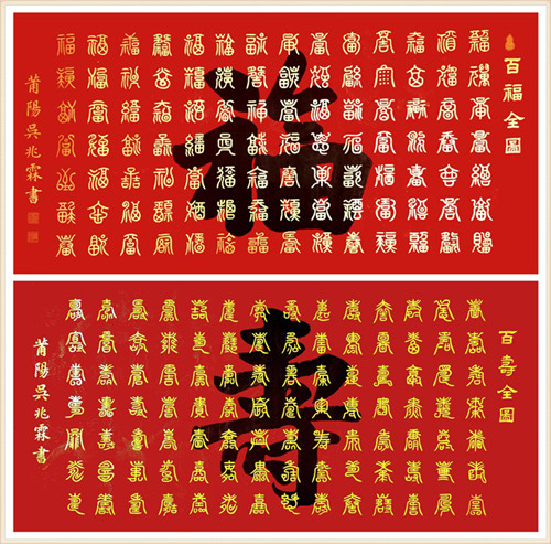 上:四尺篆书横幅《百福图》 下:四尺篆书横幅《百寿图》