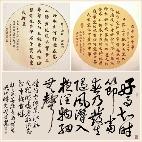 左上:朱笔楷书小团扇陶渊明诗《读山海经》 右上:朱笔楷书小团扇《我爱你中华》