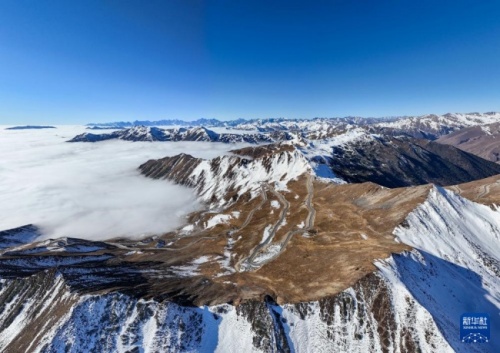 冬日的四川夹金山,云海翻腾。从高空俯瞰,连绵起伏的群山被云海笼罩,呈现出壮美的自然风光。