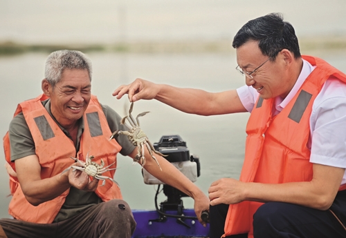 辽宁援疆干部丁敏丰与入疆养蟹的刘春邦一起查看金秋即将起捕的河蟹。