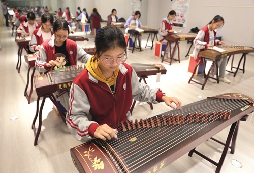 梅园中学学生社团课堂上,学生在练习演奏古筝。