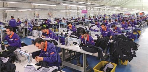 新疆京和纺织科技有限公司是和田地区规模最大的北京援疆企业,图为工人在制作服装。(图/许晓龙)