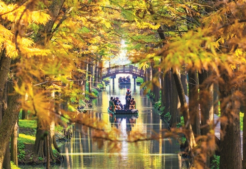 江苏兴化里下河国家湿地公园层林尽染,如画美景吸引众多游客前来游玩。(周社根/人民图片)