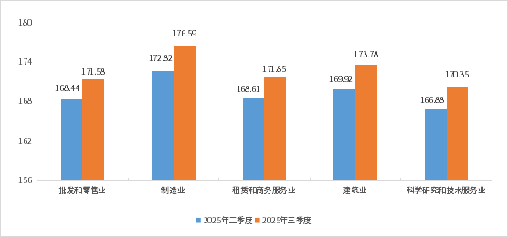 分行业看,指数运行结果显示,2025年三季度五大样本行业(批发和零售业、制造业、租赁和商务服务业、建筑业、科学研究和技术服务业)融资价格指数均有所下降,降准降息等一揽子适度宽松的货币政策能效持续释放,贷款利率持续保持在低位。五大样本行业服务可得指数和质量指数均有所增长,其中建筑业、制造业、科学研究和技术服务业可得指数环比涨幅超2%,金融对重点行业和领域的支持力度进一步加大。