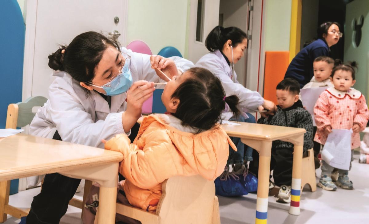 2025年12月2日,贵州省黔东南州天柱县妇幼保健院托育中心,医护人员正在为孩子检查龋齿。(龚偕延/人民图片)