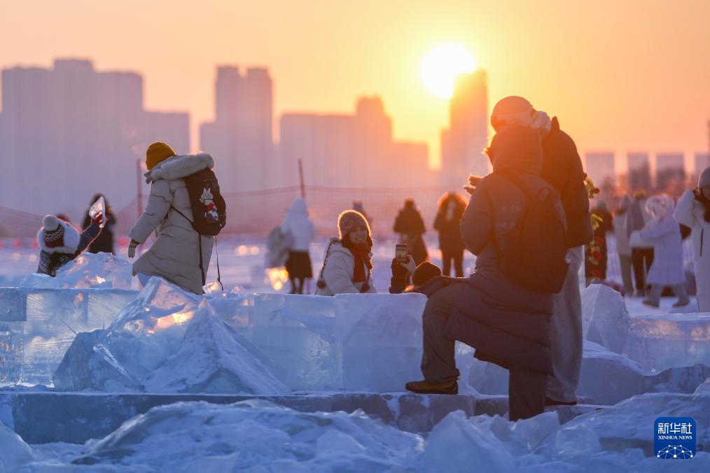 时下,“冰城”哈尔滨市正值冰雪旅游旺季。松花江哈尔滨段一处采冰场,由于大量堆积高纯净度的冰块,而被游客称为“钻石海”,成为网红景区。只要是晴好天气,都会有许多游客来到“钻石海”景区,欣赏浪漫的落日美景。