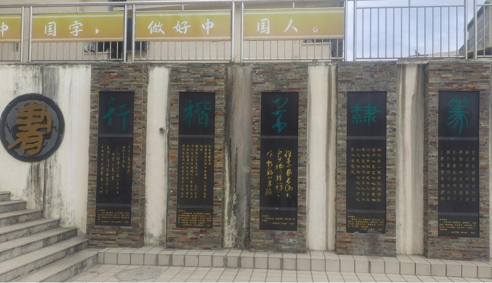 漫步校园,书法元素无处不在。“水墨清韵”景观中,长达2米的端砚与《劝学》石刻相映成趣,传递着崇文尚学的古训;“五体碑林”汇聚篆、隶、楷、行、草五种字体,每块碑石均附有释文详解,成为学生随时可学、随地可练的“露天课堂”;教学楼梯间,“笔墨纸砚”主题展板图文并茂,电子屏滚动播放书法名言警句;50多米长的书法展览长廊定期更新师生作品,让每一面墙壁都成为“会说话的书法教材”,校园处处洋溢着浓厚的书香墨韵。