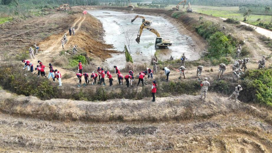 2025年肇庆怀集“6・17”特大洪灾中,广东医科大学国旗护卫队星夜驰援,与“岳山民兵连”结下深厚情谊;半年后,环北广东工程二期建设号角吹响,岳山民兵千里赴约,湛江学子再度集结,“国旗红”与“迷彩绿”在墨坑村山塘边重逢。施工现场,民兵操作机械娴熟有力,青年学子挥锹铲淤、协作默契有序,勾机、油锯、割草机轰鸣作响,号子声、铁锹声此起彼伏,奏响了一曲红色基因融会贯通的劳动乐章。