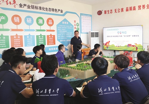 全国劳动模范、正高级农艺师卢彦鸽(图中站立者)给河北农业大学师生讲解太行婆枣农耕文化传承。
