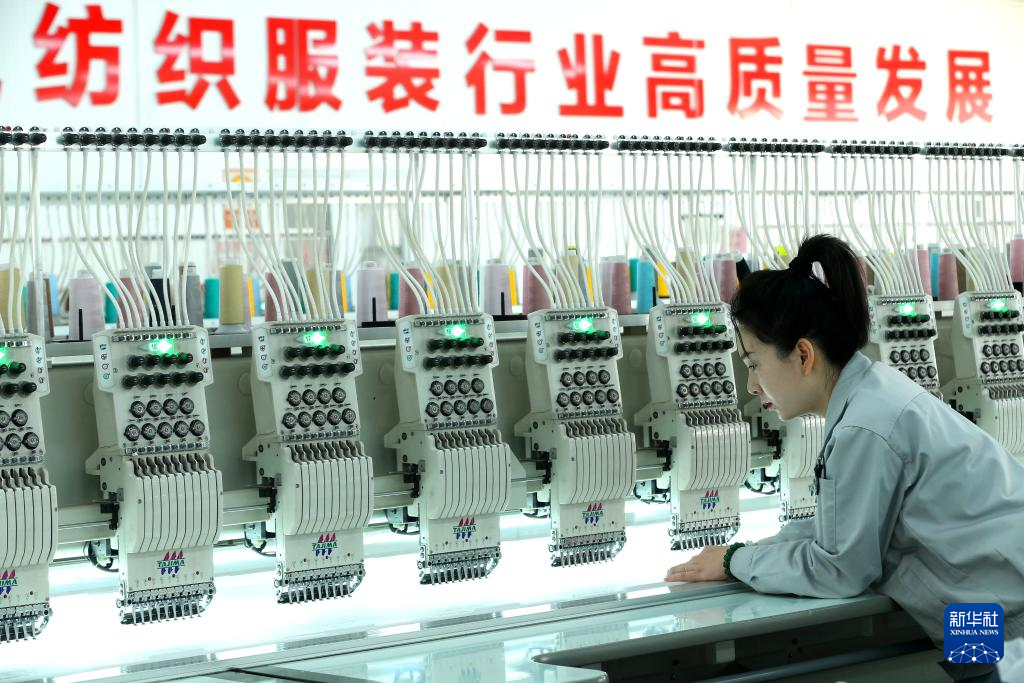 2月22日,山东省青岛市即墨区即发集团有限公司的工人在绣花生产线上忙碌。