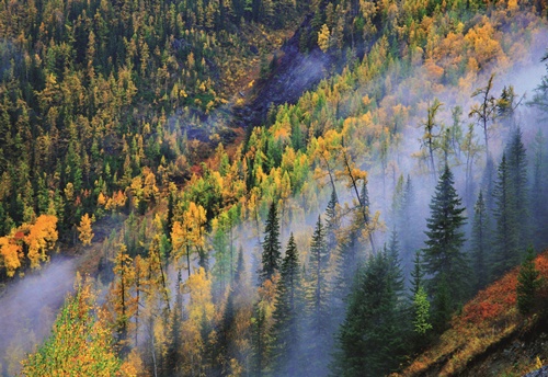 新疆喀纳斯,浓雾笼罩着神秘茂密、层林尽染的天然林。