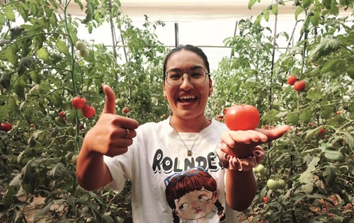 东营援疆助力疏勒县壮大“南疆菜篮子”。图为种植户展示日光温室种植的西红柿。