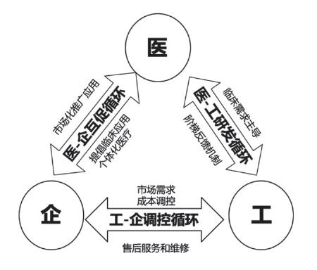 第三个循环是“医企互促循环”,是指产品通过临床应用,实现市场化推广,并由医院团队指导临床应用,制定个体化医疗方案。而这又反过来推动技术持续迭代更新,最终将基础研发成果转化为安全可靠、国际认可、容易普及的创新产品。