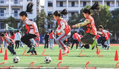 3月13日,江西省宜春市宜丰县新昌镇第三小学的学生在大课间进行体能训练。(周亮/人民图片)