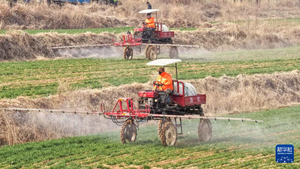 3月23日,在山东省荣成市虎山镇,农机手对小麦进行施肥和病虫害防控作业。