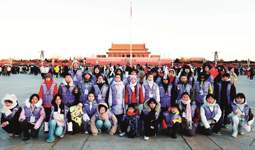 参加“苏韵伊情·青苗筑梦”小记者冬令营的伊犁青少年在北京天安门广场观看升旗仪式后合影。