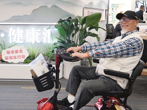 老年人在深业·健康汇老年用品商城体验电动代步车。