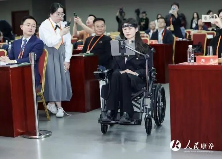上图:工作人员通过“脑机接口”操作脑控轮椅入场。脑控轮椅将助力失能半失能老年人解决行动不便的难题。