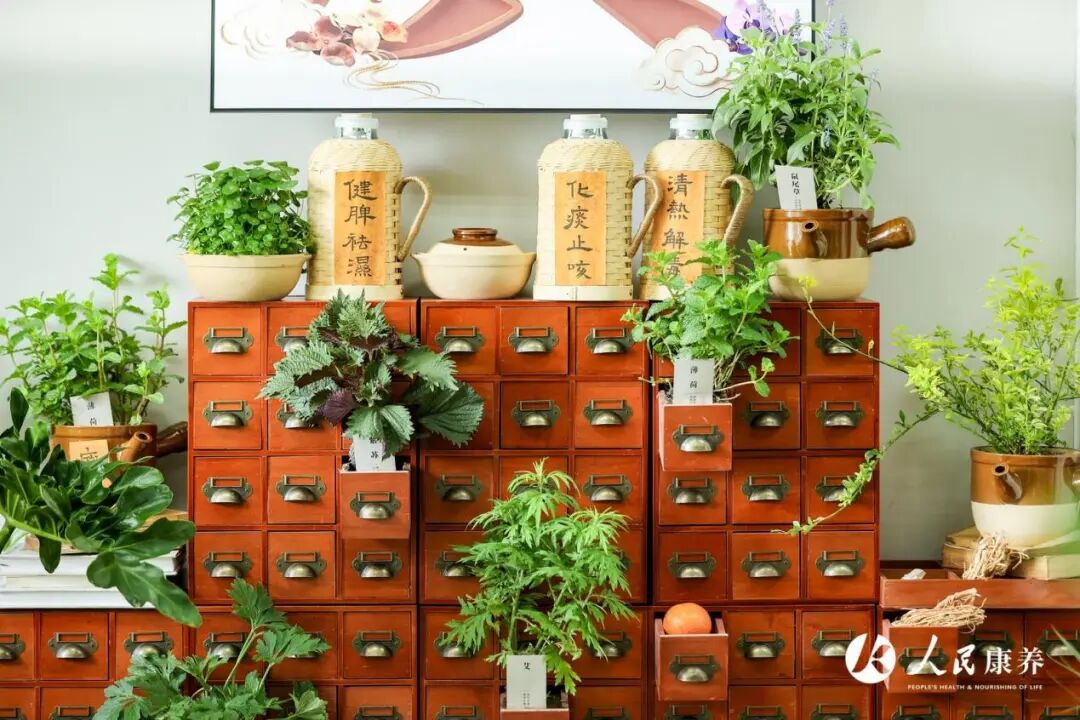 上图:“疗愈花园”将瓦罐瓦煲、凉茶壶、中药柜等岭南生活元素与草本养生植物相结合,让参观者在沉浸式体验中读懂岭南养生智慧。