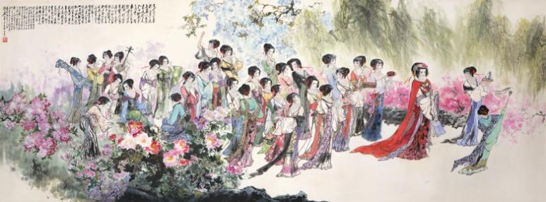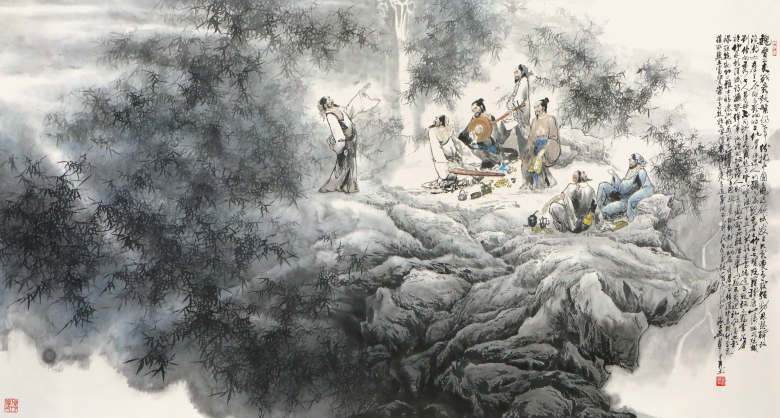 比如《魏王观沧海》《竹林七贤》《古之学者必有师》等作品,笔墨酣畅,造型生动,形、光、色、线在情感中飞动,点、线、面在意趣中各得其妙。再比如《金陵十二钗》《丽人行》《古代仕女》等等作品,敷彩润泽,用色明快,落笔得其神理,写照妙取神形,人物丝发之间,眉睫毕现,意态迥出,神形、姿貌、意态,虽在楮素之中,却盼来颦笑,惟妙惟肖,咄咄逼真。这岂是画照片者可比,又岂是逸笔草草可为,实乃表现力与绘画性的结合、写实性与写意性的辉映,彰显着扎实的造型能力,也彰显着“写照传神”“妙造其极”的表现技巧。