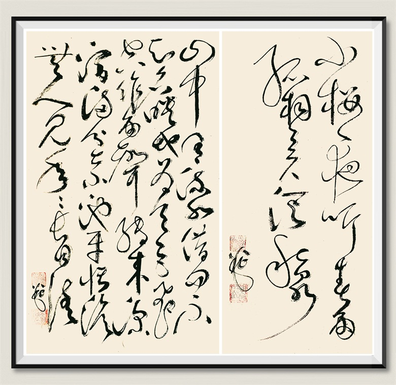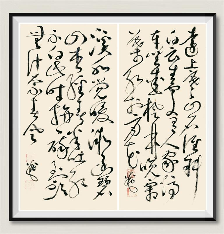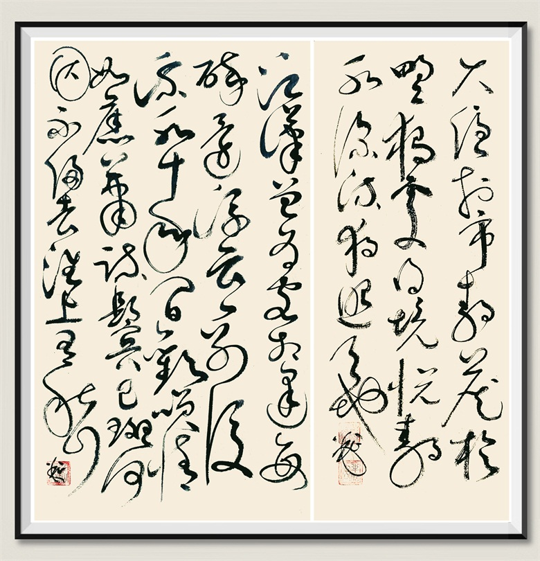 纵览杨云的草书,有怀素的奇崛、有张旭的变幻、有黄庭坚的连绵、有傅山的恣肆,还有王铎、傅山的峥嵘缠绕,大开大合之间,纵横离奇,聚散收放之间,从容娴雅。那刚与柔的交替、动与静的转换,那方与圆的辉映、欹与正的结合,在对立中保持着和谐,潇潇洒洒又彰显着真功,险峻而严守着法度,共性中又凸显着个性。入笔、行笔、出笔,时而快慢、时而收放、时而疏密,自由自在,吾写吾心,却无浮躁荒率之气,更无剑拔弩张之感,却带一点点行书的灵秀、典雅、萧散,而灵秀处,姿态朗逸,典雅处,婉润劲健,萧散处,隽永秀逸。若说横如千里阵云,点如高峰坠石,撇如陆断犀象,戈如百钧弩发,竖如万岁枯藤,捺如崩浪雷奔,横折钩如劲弩筋节,皆有,却不能言其妙,若说章法、线条似长风出谷、如霓虹饮涧、像瀑布飞流,也皆有,却也绝不能道其真。那是书,也是画,书法如画,画有妙意。