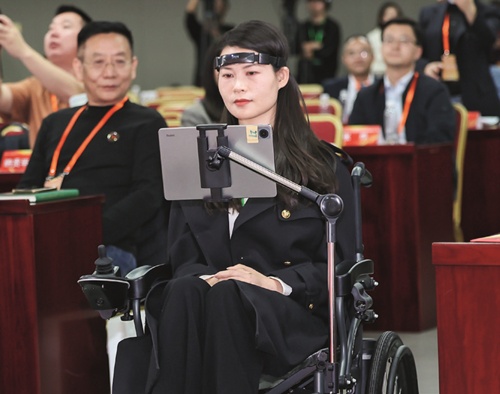 工作人员在第四届人民康养大会现场演示非侵入式脑机接口技术驱动脑控轮椅。