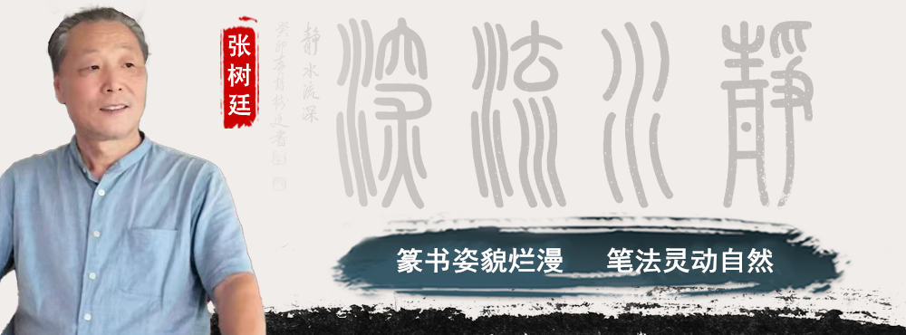 张树廷的篆书恪守传统主流正脉之道,同时兼具独特的书写样式。他善于通过篆书的烂漫加强线条的韧劲和力度,从而使线条逸致翩翩,姿态饱满,富有张力;同时,喜欢通过拓展体势,因地制宜地构造字体的舒展范围,让每一个字都与章法相互呼应,行列井然有序。