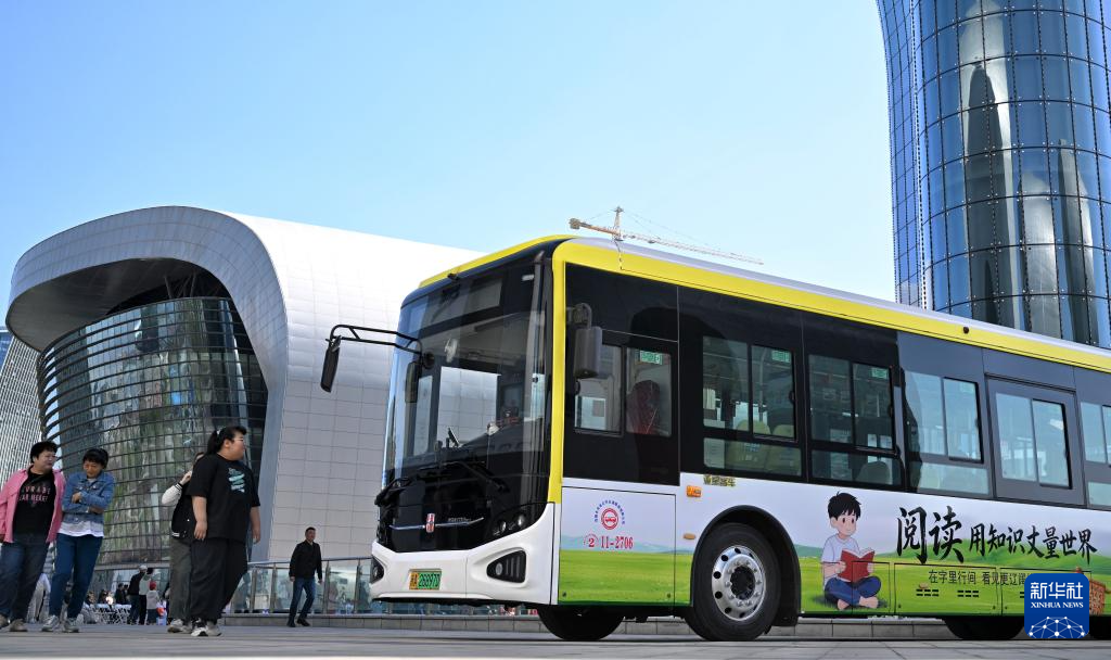 这是4月19日在乌鲁木齐街头拍摄的一辆车身印有“阅读 用知识丈量世界”宣传标语的公交车。