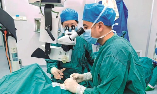 江西医疗援疆结出“光明硕果”。图为2025年3月7日,当地医生司马义·胡大白(右)独立完成第一例白内障手术。