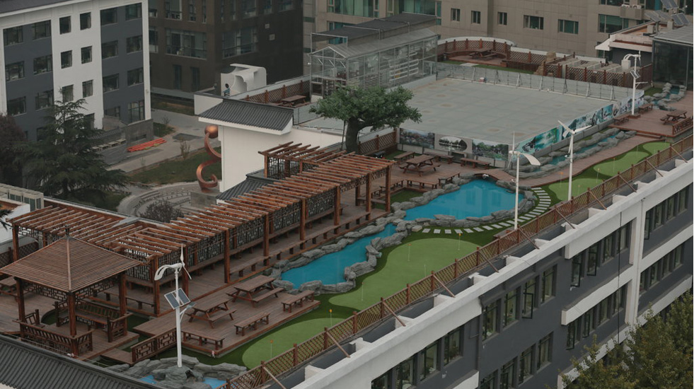 北青报记者随后来到位于苏州街的与北京市八一中学相邻的写字楼,从高楼上俯瞰,在八一中学内一座建筑物的楼顶,确实有照片中的景观——湛蓝的池水,碧绿的草坪,木制的小桥,还有走廊、凉亭、桌椅……似一个袖珍公园,弯弯曲曲的小径旁还散落着几个白色风车,楼顶的一角铺满了太阳能电板。