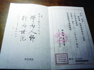 “到学校后看到黑板上写着北师大录取一人,我的心情很紧张,因为不知道除了我之外还有没有其他人报北师大。”杨洪波是云南玉溪第一中学的考生,他说,进到办公室,班主任拿出一个牛皮信封,里面就是他的录取通知书,“当得知这录取的一个就是我时,我跳了起来,情不自禁拍了一下手,感觉那一刻是自己最快乐的一刻了。”