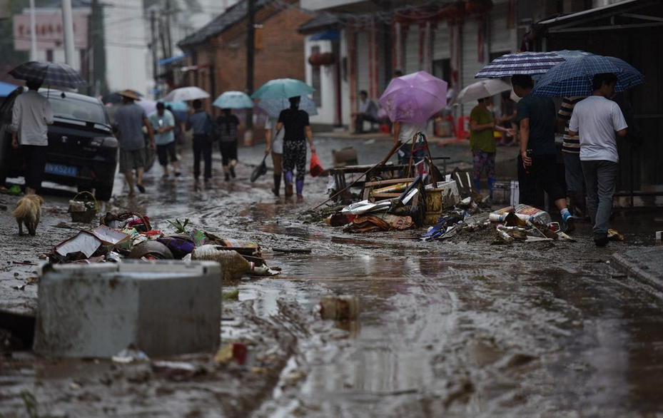 2015年8月10日下午,台风过境后的安徽霍山诸佛庵镇。受台风“苏迪罗”影响,8月10日凌晨,安徽霍山县境内普降大暴雨,局部特大暴雨,降雨量最高达339.9mm。暴雨重创大山深处的诸佛庵镇,集镇水深达2.1米、淤泥达60—80厘米。两名干部因公殉职(佛子岭镇党委书记和佛子岭镇副镇长),两名群众涉水死亡(杜某,男,83岁;操某,女,78岁)。图为村民在冲毁的家前愁眉不展。江雨 摄