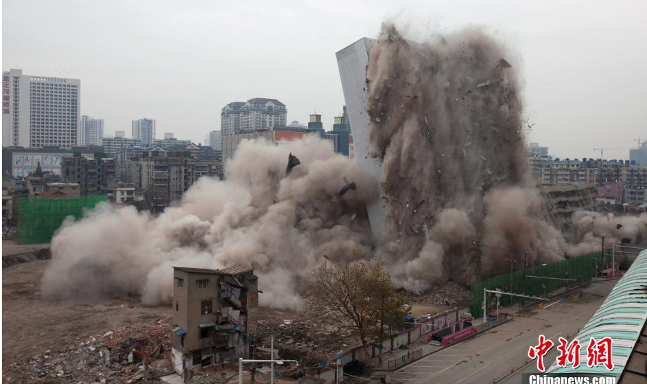 12月9日,位于武汉市硚口区银丰片群楼采用爆破方式进行拆除。此次爆破使用“一次点火,顺次重叠倒塌”的爆破方案。爆破楼群中的银丰宾馆,是目前武汉闹市区爆破拆除大楼中,有史以来最高建筑。银丰片群楼爆破拆除工程,包括有20层、高77米的银丰宾馆和中自小区2栋9层住宅楼,总建筑面积约3.5万平米。 中新社发 张畅 摄