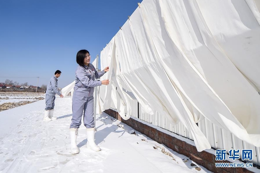 2月23日,卜睿(右)在整理做豆腐用的白布。 新华社记者王昊飞摄