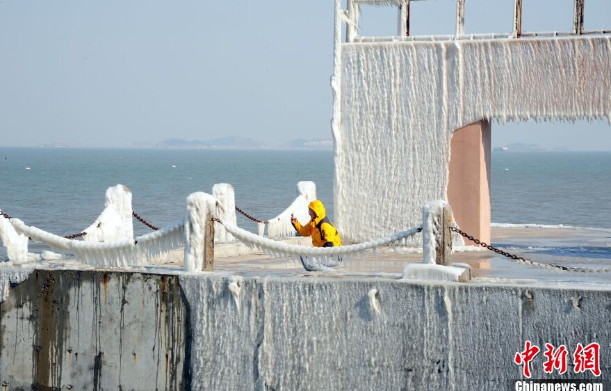2月9日消息,受强冷空气影响,中国北方海滨城市烟台8日迎来入冬以来最低气温。烟台海滨出现大面积冰凌奇观,岸边铁链被晶莹剔透的冰包裹,上面挂满了冰凌,像一把把白玉做的锥子,绵延千余米,蔚为壮观,吸引许多游客和摄影爱好者。杨兵 摄
