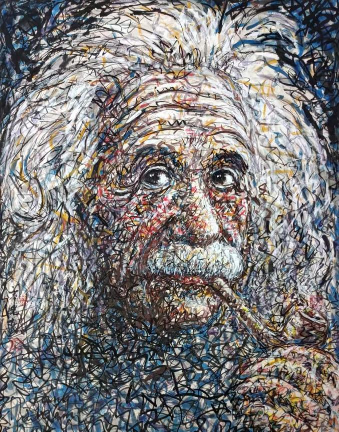 在他的笔下,宣纸、水墨和丙烯是他绘画的法宝,“从无序到有序”成为他的绘画哲学。如他所言,他试图用科学的思维将线条扭曲成极具立体感、有棱角的画面。这也正如时任中国科学院院长路甬祥所赞誉“乱线画是一种创造,无序中有序,抽象中具体,模糊中清晰。给人美的沉思与遐想,与科学技术中的模糊、随机、混沌的概念是相通的。”